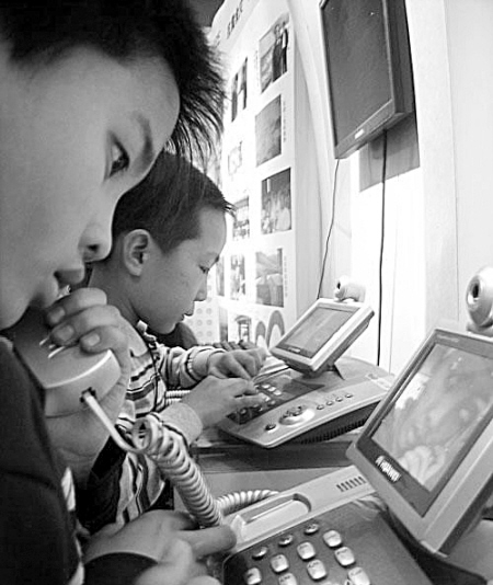 2009年4月30日,山东淄博张店区铁路小学的学生在网通展览馆体验可视电话。