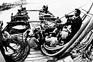 1982年, 福州万门程控电话安装现场。图为邮电工人在水上施工布缆。