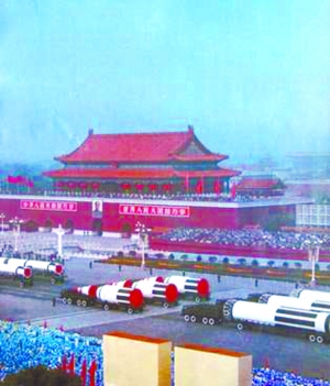 这次阅兵,我国自行设计制造的远程、中程和洲际战略导弹第一次揭开神秘的面纱,特别引人注目。威武的长剑战车以昂扬的姿态向世人表明:中国战略导弹部队已肩负起捍卫祖国安全的神圣使命。
