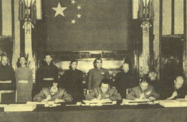 中央人民政府全权代表和西藏地方政府全权代表经过谈判之后,对和平解放西藏取得了一致的意见。一九五一年五月二十三日,《中央人民政府与西藏地方政府关于和平解放西藏办法的协议》在北京正式签订。签字仪式由中央人民政府副主席朱德、李济深,中央人民政府政务院副总理陈云主持。