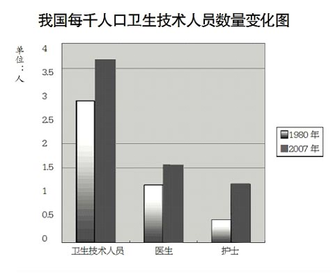 上世纪70年代末,卫生资源严重短缺,导致“看病难、住院难、手术难”问题突出。30年来,我国医疗卫生资源持续增加,结构不断优化。2007年,全国医院床位总数比1978年增长81%,全国医疗卫生人员比1980年增长67%。目前,我国每千人口医生、护士(师)数虽然低于大多数发达国家水平,但已超过了亚洲地区平均水平,也超过了世界平均水平。