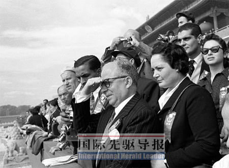 1957年10月1日国庆节,天安门广场举行庆祝活动。在天安门观礼台上的埃及电影代表团。吕厚民/摄