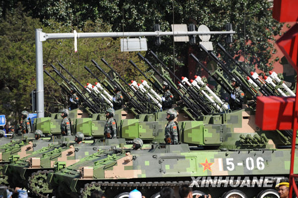 10月1日,首都各界庆祝中华人民共和国成立60周年大会在北京天安门广场举行。这是轮式自行突击炮方队通过天安门广场。新华社记者郭大岳摄