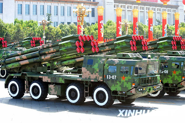 10月1日,首都各界庆祝中华人民共和国成立60周年大会在北京举行。这是远程火箭炮方队通过天安门广场。新华社记者李晓果摄