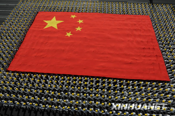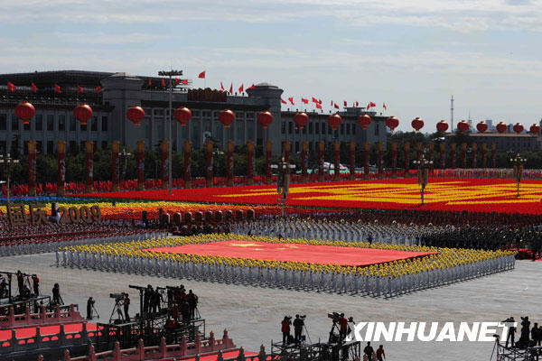 伴随着雄浑的《红旗颂》乐曲,“国旗方阵”的1949名男青年高擎面积近600平方米的五星红旗,高呼“祖国万岁”等口号,走在游行队伍的最前面。