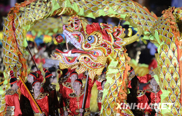 10月1日,首都各界庆祝中华人民共和国成立60周年联欢晚会在北京天安门广场举行。这是舞龙队在天安门广场联欢区表演。 新华社记者 吴晓凌摄