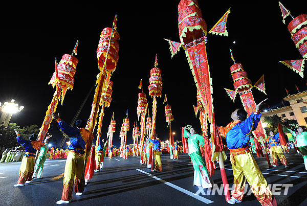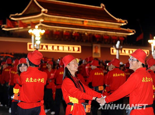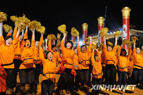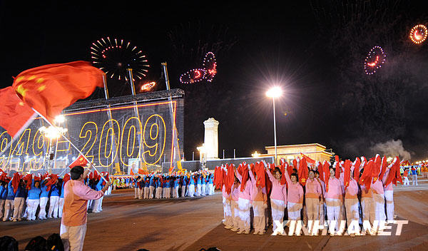 10月1日,首都各界庆祝中华人民共和国成立60周年联欢晚会在北京天安门广场举行。这是演员在天安门广场上表演节目。 新华社记者 王颂摄