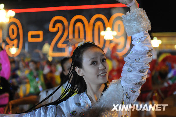 10月1日,首都各界庆祝中华人民共和国成立60周年联欢晚会在北京天安门广场举行。这是联欢群众在表演。新华社记者 王颂摄