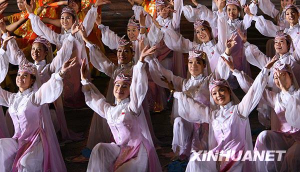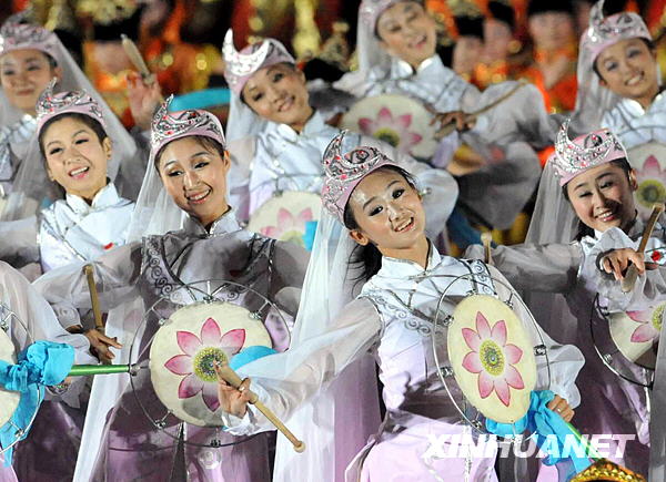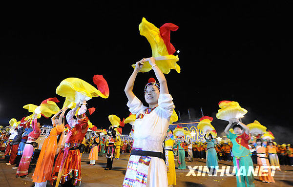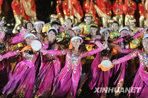 10月1日,首都各界庆祝中华人民共和国成立60周年联欢晚会在北京天安门广场举行。这是演员在天安门广场表演民族舞蹈。新华社记者陈晓伟摄