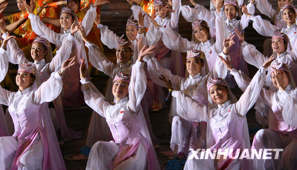 10月1日,首都各界庆祝中华人民共和国成立60周年联欢晚会在北京天安门广场举行。这是演员在天安门广场上表演民族舞蹈。 新华社记者陈晓伟 摄
