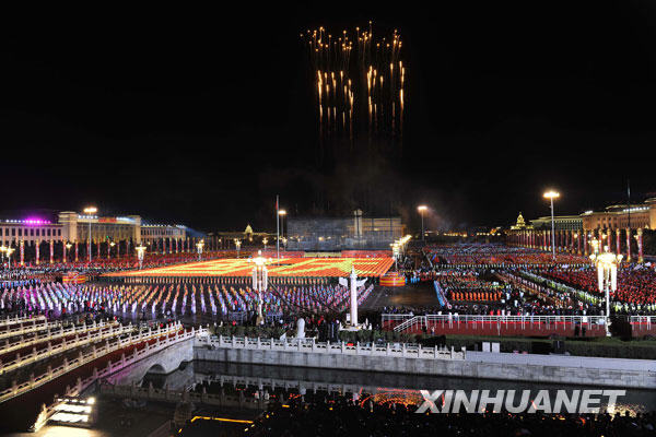 这是烟花在天安门上空绘出“60”的图案。新华社记者郭大岳摄