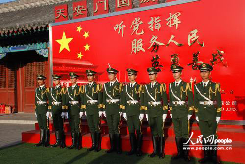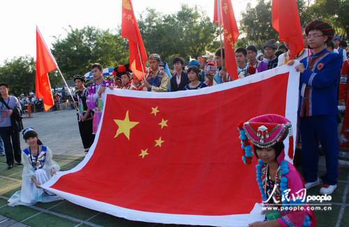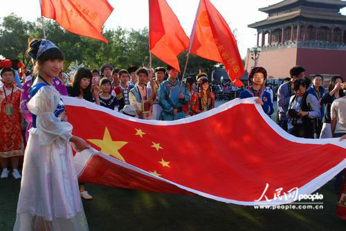作为“我爱我的祖国----中华各民族青少年同心营”的营员,这些学生们10月1日参加了新中国60年华诞庆祝活动,站在天安门广场国旗杆东、西、北三侧,代表56个民族,向国旗敬礼,迎接国旗升起。