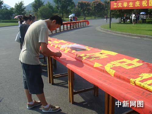 记者在现场看到,很多大学生正在横幅上庄重签上自己的名字。横幅上“高举国旗、高唱国歌、不负重托、不辱使命、大力弘扬伟大的爱国主义精神,在实现中华民族伟大复兴的历史征程上谱写我们辉煌的青春乐章”的口号,被来往的学生一遍遍传诵。