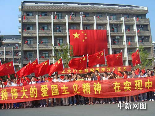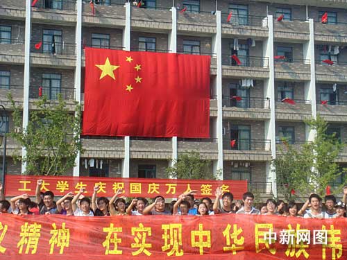 网友流年似留言:“我们从现在开始挂国旗,一直挂到10月8日,让校园到处是五星红旗。我们还可以用五星红旗挂出‘祖国万岁’的大型字样,让大家看看,我们也是非常爱国的。”正是众多网民的群策群力,才有了这次万人签名的“壮举”。