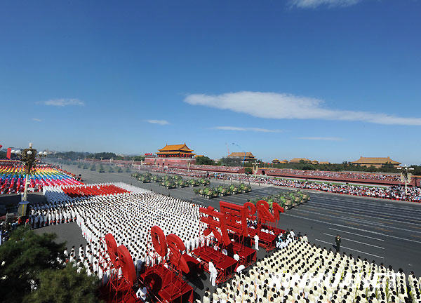 10月1日,首都各界庆祝中华人民共和国成立60周年大会在北京举行。这是受阅部队通过天安门广场。新华社记者 丁林摄