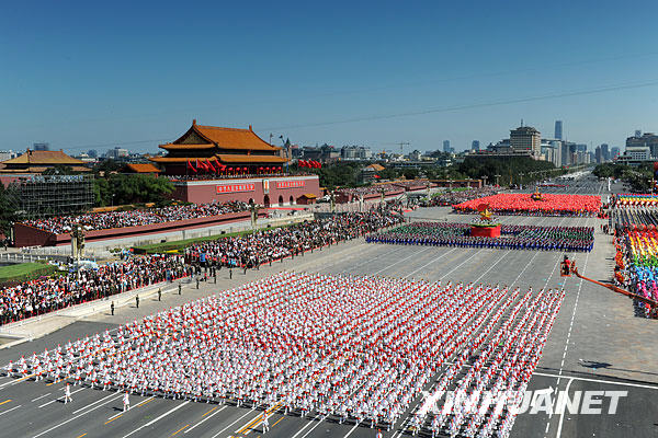 10月1日,首都各界庆祝中华人民共和国成立60周年大会在北京举行。这是《七色光》少先队鼓号队表演经过天安门广场。新华社记者 杨磊摄