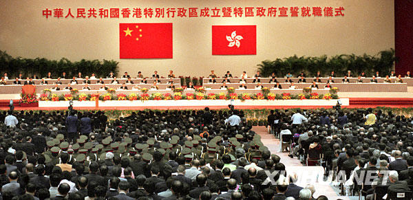 1997年7月1日0时0分0秒,中国政府恢复对香港行使主权。这是当日凌晨,中华人民共和国香港特别行政区成立暨特区政府宣誓就职仪式在香港会议展览中心新翼七楼隆重举行。新华社发