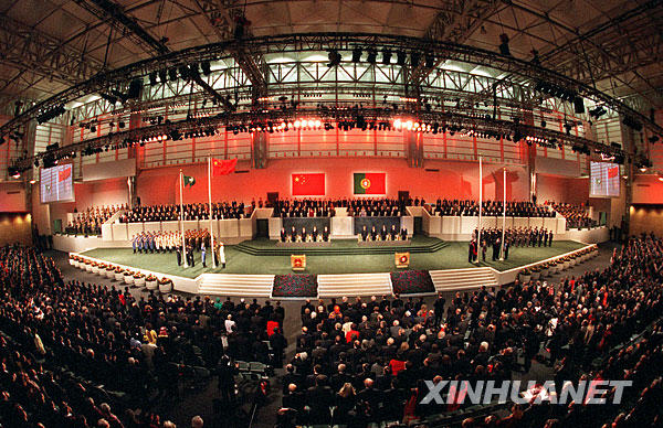 1999年12月19日午夜至20日凌晨,中葡两国政府澳门政权交接仪式在澳门隆重举行,中国对澳门恢复行使主权。新华社发