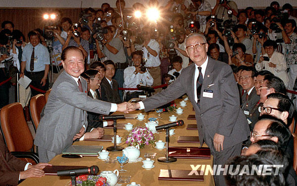 1993年4月,海峡两岸两个民间团体的领导人汪道涵和辜振甫在新加坡会晤。这是1993年4月27日,海峡两岸关系协会会长汪道涵(左)与海峡两岸交流基金会董事长辜振甫首次会谈前握手。新华社发