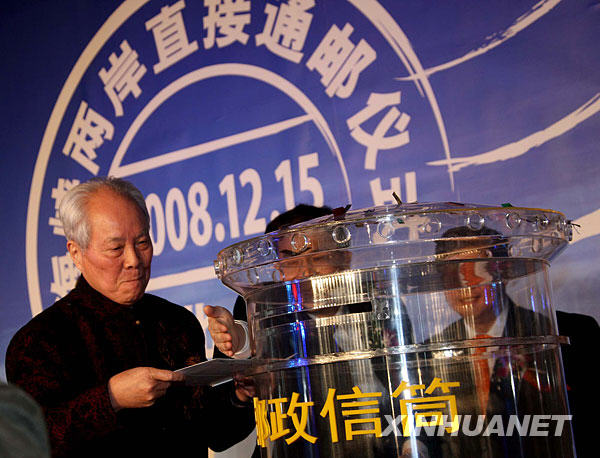 2008年12月15日,出生在台湾的郑坚老先生在北京举行的两岸直接通邮仪式上投寄出寄往台湾的家书。当日,众望所归的两岸海运直航、空运直航以及直接通邮正式启动,两岸同胞魂牵梦萦的直接“三通”得以基本实现。新华社发