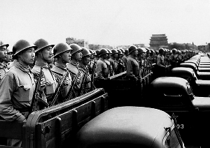1950年1月,中央军委批准全军实行统一的新军服方案,简称50式军服。10月1日,陆海空三军部队着50式军服受阅。受阅陆军着黄绿色服装,空军着上黄绿下藏蓝色服装,海军着白色服装。陆海空三军佩戴统一制式的帽徽和胸章,整齐划一,面貌一新。新中国成立后人民解放军第一次有了统一制式、统一标准的军服。