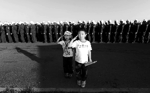 阅兵村空军飞行员驻地,两个男孩向过往的军官敬礼,他们随妈妈来看望参加阅兵的爸爸。卢炳广 摄