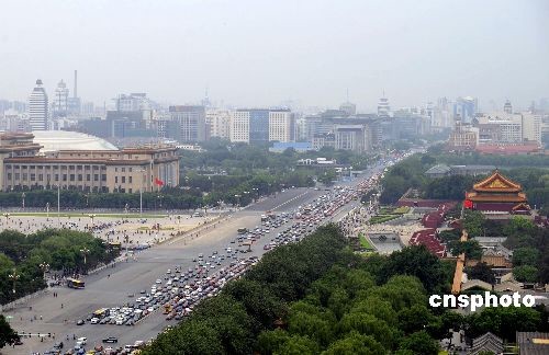 资料图:2009年5月21日,瞭望天安门前正在进行大修施工的长安街上车辆行驶井井有条。