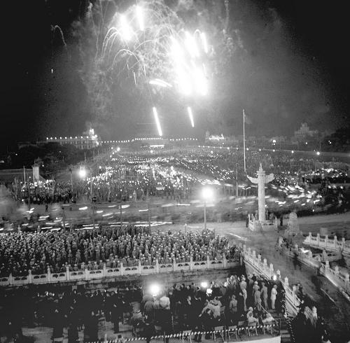 北京,丁字形的天安门广场。汇成海洋的人流,此刻正为天下太平而欢呼。