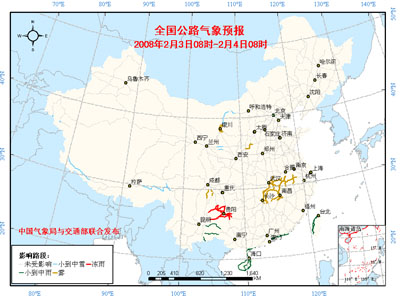 新华网消息 中央气象台: 3日08时至4日08时,新疆西南部、西藏西部和东南部的部分地区阴有小到中雪或雨夹雪;四川东南部、云南东北部和南部、贵州西部以及台湾中东部等地阴有小雨或雨夹雪,其中,贵州西部部分山区有冻雨。东海及其以南海区有5~7级偏北风。