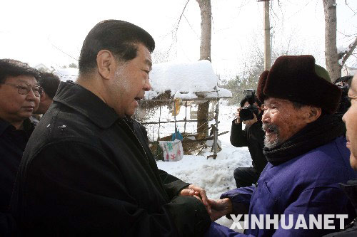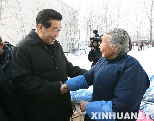 1月30日至2月1日,受胡锦涛总书记委托,中共中央政治局常委、全国政协主席贾庆林先后来到合肥、六安等受灾严重的地区,深入火车站、汽车站、供电公司、农产品批发市场、蔬菜生产基地、敬老院和农户家中,实地察看工农业受损和群众受灾情况,慰问奋战在抗灾救灾第一线的广大干部群众、人民解放军、武警部队官兵和公安民警。这是1月31日,贾庆林来到六安市舒城县桃溪镇农户家慰问受灾的老人。 新华社记者刘卫兵摄
