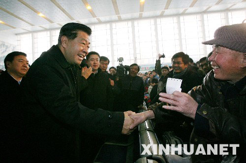 这是1月30日,贾庆林在合肥客运总公司明光路汽车站候车厅看望候车的旅客。 新华社记者刘卫兵摄
