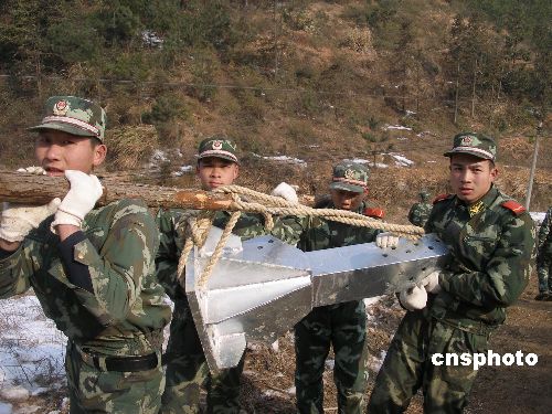 2月8日,湖南省娄底市武警支队100多名武警官兵冒着风雪和山高路滑,每天将近20吨电力铁塔的部件分散运送到湘乡市壶天镇山上进行线路抢修。 中新社发 郭国权 摄