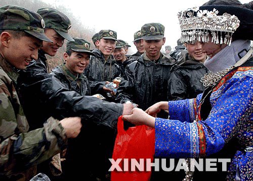 2月17日,当地群众自发前来慰问解放军官兵。当日,成都军区某部百名官兵在贵州省黔东南州三穗县抢修遭受凝冻灾害的青穗输电主干线。这条线路是三穗县连接国家电网的主要通道。 新华社发(黄震 摄)