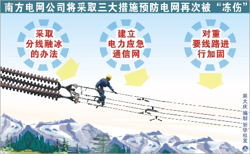 据南方电网公司总经理赵建国介绍,专家们通过研究和反复计算后认为,南方电网公司今后在预防电网再次被“冻伤”上,可以采取以下三项综合措施: