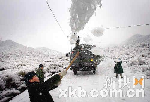 冰路难行,裹着厚厚冰棱的高压电线挡住去路,战士破冰开路。