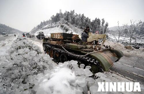 2月3日,解放军某部出动坦克牵引车支援京珠高速湖南段疏通。 新华社发