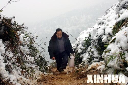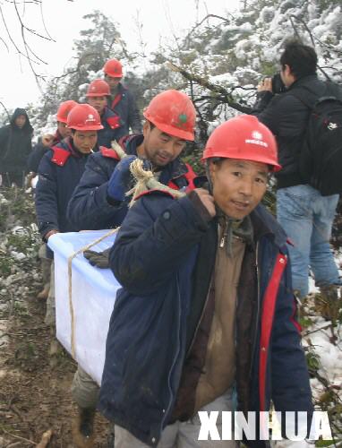 这是抢修萍乡电网的工人们从山下扛上来他们的“除夕午餐”。 新华社记者林艳兴摄