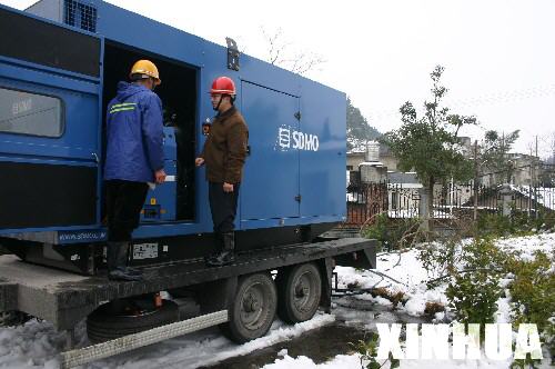 这是芦溪县供电公司的职工在武功山风景区管委会大院的雪地里安装从浙江运来的移动电站。 新华社记者林艳兴摄