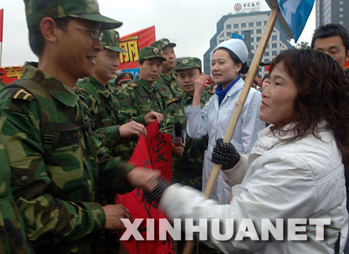当日,湖南郴州市委、市政府在五岭广场举行欢送仪式,送别来郴州支援抗冰救灾的部队官兵。上万市民自发来到五岭广场送别部队官兵。当晚6时许,200多名二炮某部官兵离开郴州。 新华社发(李细万 摄)