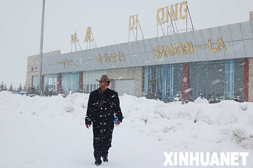 1月30日,在云南香格里拉机场,一名工作人员在雪地行走。