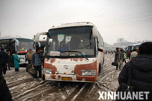 1月30日,在长沙市汽车西站,营运客车准备出站。当日,因出现短暂晴好天气,气温略有回升,长沙市东、南、西3大长途汽车站恢复大部分客运班线。由于公路仍有冰雪,车辆行驶缓慢,每条班线开行的班次比平时减少。