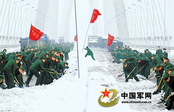 连日来,武警江苏总队一支队共出动官兵四千余人次,在南京长江二桥、高速公路等交通主干道清扫积雪。图为一月二十九日,官兵正在清除南京长江二桥上的冰雪。郎从柳摄