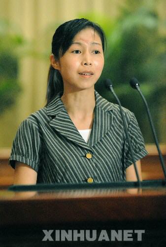 这是陕西省汉中市宁强县黄坝驿乡中心学校教师王敏在报告会上发言(6月11日摄)。 当日,共青团十六大抗震救灾英模事迹报告会在北京人民大会堂举行。 新华社记者 陈晓伟 摄