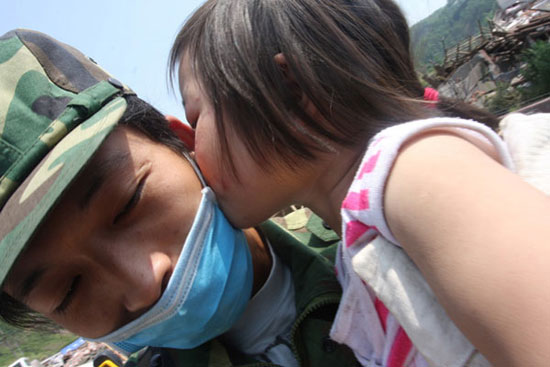 小女孩亲吻前来救援的解放军叔叔。(来源:大河网)