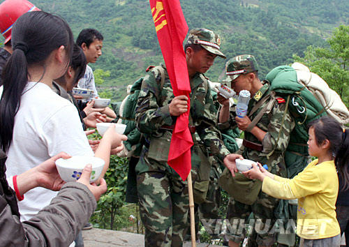 5月18日,在汶川县漩口镇漩口村,一位小女孩给武警四川总队达州支队的战士们送水。新华社发(官国平 摄)
