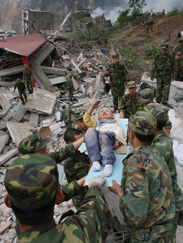 在地震发生十余小时后,一位满脸是血的北川男孩——3岁的郎铮从废墟中被救出。就在武警官兵准备把他转移到安全地带时,他艰难地举起还能动弹的右手,虚弱而又标准地敬了一个少先队队礼。(图片来自:新华论坛)