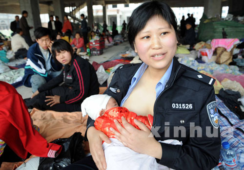 5月16日,四川江油县公安局女民警蒋小娟在地震灾民庇护所为一名地震灾区孤儿喂奶。蒋小娟义务为一些急需哺乳的地震灾区孤儿喂奶,却“狠心”把自己才6个月大、同样需要母乳喂养的孩子交给父母照料。 |