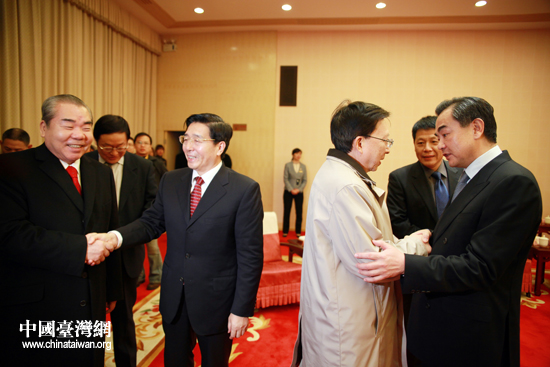 中国台湾网1月17日桂林消息  17日晚,广西壮族自治区党委书记郭声琨和中台办、国台办主任王毅一起,会见来桂林参加第九届两岸关系研讨会的台湾中华文化总会会长刘兆玄等嘉宾。
