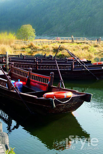 距县城十来公里左右的北海湿地很特别,属高原火山堰塞湖生态系统。我们所见到的成片成片的草块都是漂浮在水面上。倘若你以为水很浅,草生长在水底泥上,那就错了,实际上成片成片的水草的根须经过千万年的生死串结而成,厚度大约在1米,被称为“草排”,下面水深足有十几米。当地人以前经常把分开的一小片草排当船来划,捕鱼虾。如今为了环保及安全,湿地被保护起来,草排也是分片对游人开放,人工搭起的木板平台桥一直延伸到湿地中,供游客穿行于草地上,欣赏周围美景。不过乘坐游船深入漂浮的草排中,穿着雨靴体验一把“踩”草排的经历,却是最让人津津乐道的事儿。