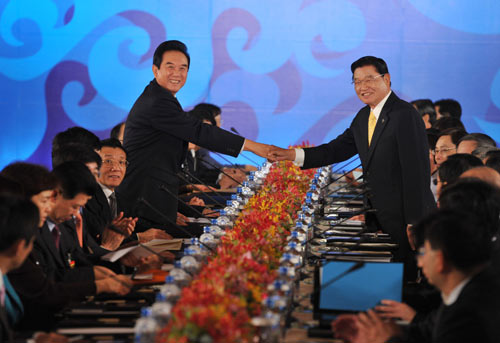 第6次两岸两会领导人商谈21日在台北圆山饭店举行,海峡两岸关系协会会长陈云林(左立者)与海峡交流基金会董事长江丙坤(右立者)握手合影。 图片来源:“中央社”